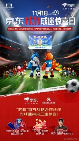 随着江苏省城市足球联赛(以下简称“苏超”)决赛战幕将启,作为苏超官方战略合作伙伴,京东11月1日推出京东11.11“球迷惊喜日”主题活动,通过多重福利活动,为球迷带来一场沉浸式的观赛体验。活动期间,消费者不仅可1元竞拍C罗、梅西等众多球星亲签球衣等稀缺藏品、参与决赛竞猜赢取宇树机器人、百吋电视、超市好物等,还能在苏超决赛夜到京东头号玩家直播间与明星球迷武艺线上互动,有机会获得欧冠决赛门票。即日起,打开京东APP搜索“球迷惊喜日”,即可一键畅享球迷盛宴。