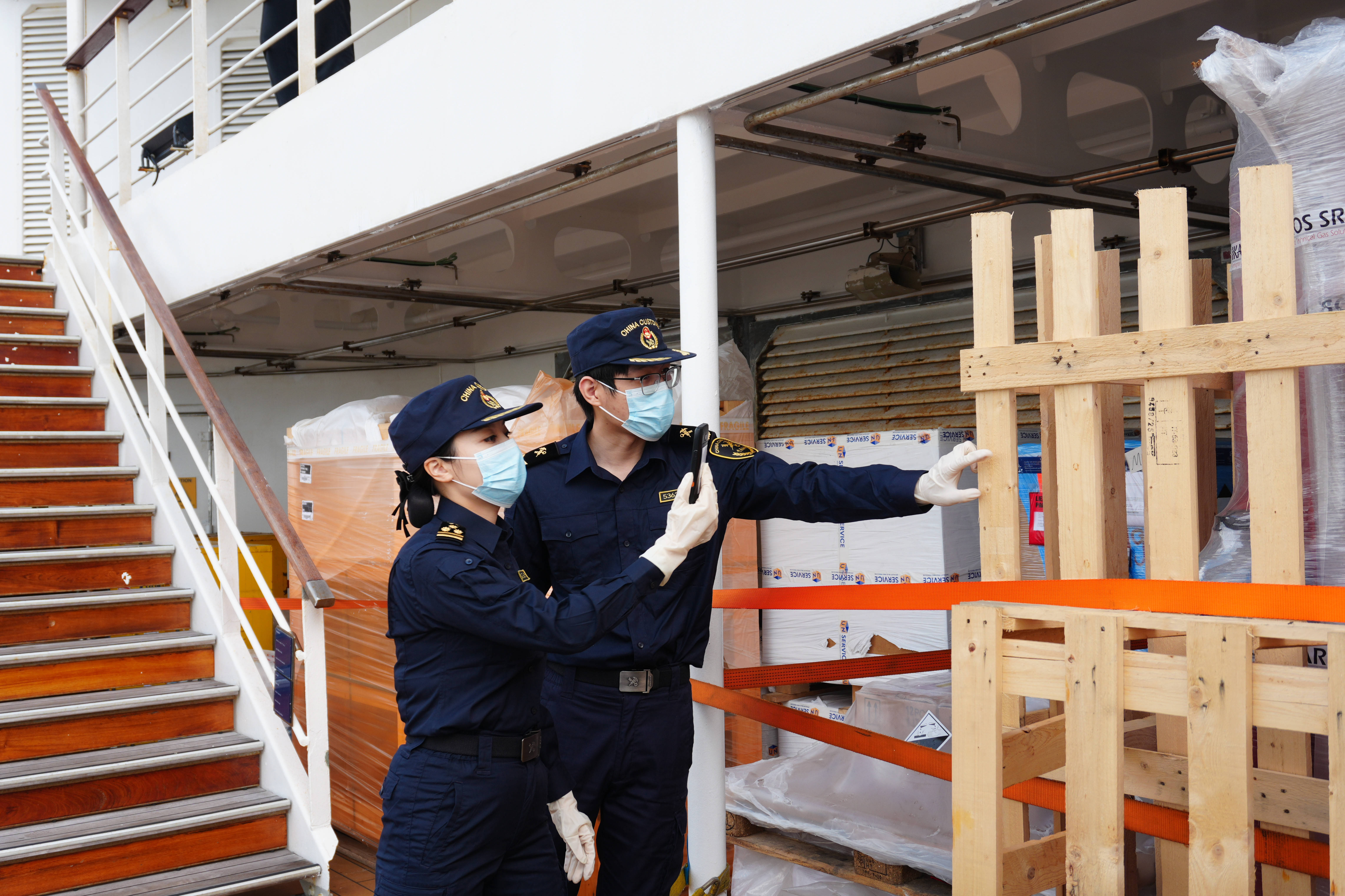关员对“歌诗达•赛琳娜号”邮轮中所使用的木质包装合规性进行检查。(通讯员 罗鹤 摄)“歌诗达·赛琳娜号”邮轮总吨位达8.7万吨,载有约1100名船员,另有600名外籍工程师需集中入境参与此次维修作业。邮轮吨数大、通关人数多、维修时间长,对口岸通关和监管服务提出了极高要求。