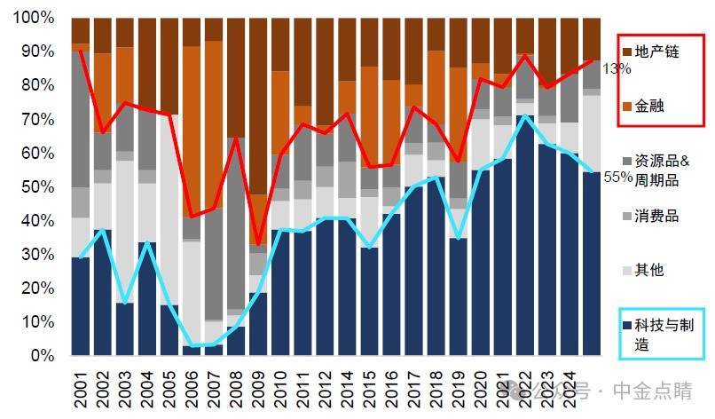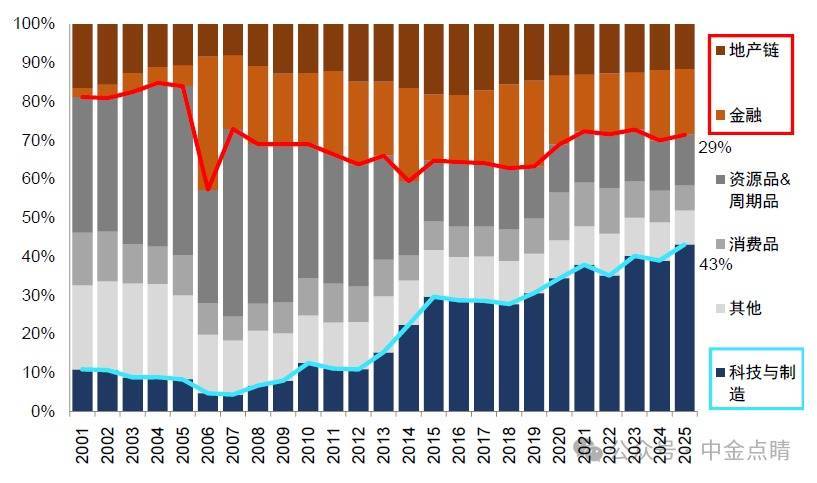 注:基于一级行业分组。地产链:房地产、机械设备、建筑装饰、建筑材料、家用电器、轻工制造;金融:银行、非银金融;资源品&周期品:煤炭、石油石化、有色金属、钢铁、基础化工;消费品:食品饮料、纺织服装、商贸零售、社会服务;科技与制造:电子、计算机、传媒、通信、汽车、国防军工、电力设备、医药生物;其他:农林牧渔、公用事业、交通运输、环保