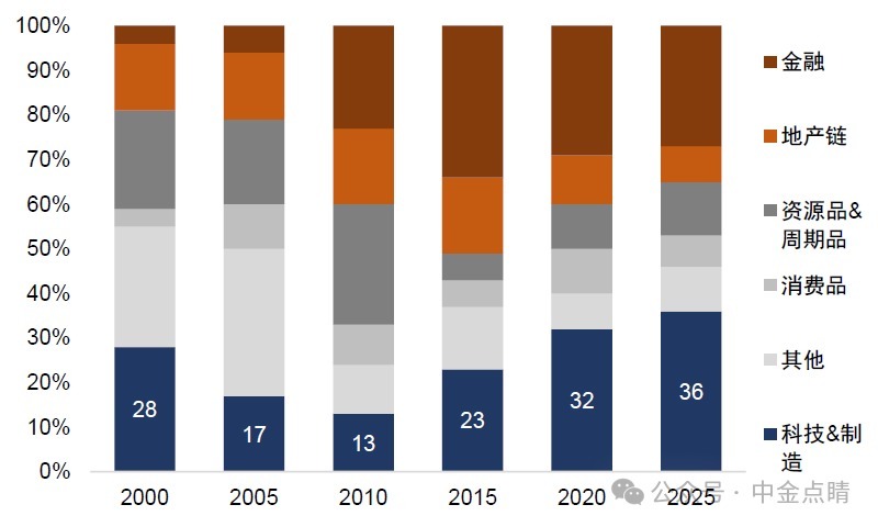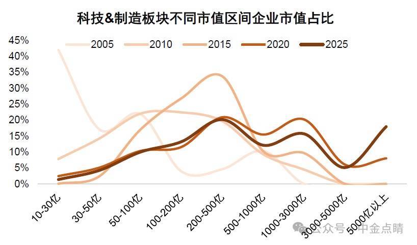 近年新兴成长领域在我国资本市场中的比重明显提升。十四五期间我国高度重视科技创新、现代化产业体系建设,资本市场从服务实体经济角度,在支持与发展新兴成长领域方面体现出更为明显的变化:1)新上市公司中科创类企业保持较高比重。A股市场IPO融资总额中科技和高端制造板块占比逐步增大,2020-2025年(截至10月24日),每年IPO募资额中科技和高端制造类企业占比的均值为60.3%(图表4)。2)大市值科创企业增多。随着我国科创领域快速发展,部分企业逐步发展壮大,具有较大规模与市场影响力的科创企业增多,科创领域中的大市值企业占比有所增加(图表3),大市值企业中的新兴成长企业占比也有所增加,目前市值前100名的A股上市公司中有36家属于科创和高端制造领域(图表6)。