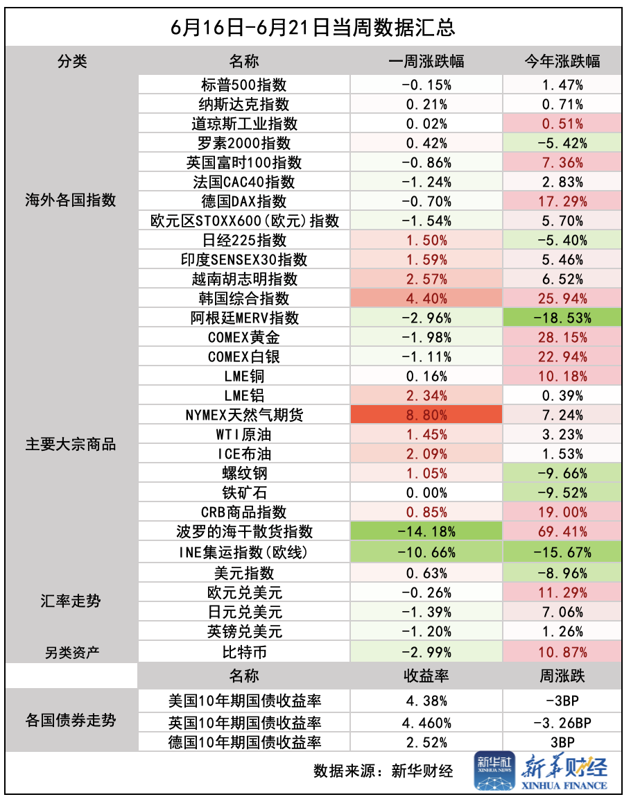 新华财经上海6月22日电(葛佳明) 本周(6月16日至21日),受中东地缘政治局势影响,大宗商品市场波动剧烈。美联储在6月的议息会议上连续第四次维持利率决议不变,且会议增量信息较少,全球各国股市多数波动不大,美元反弹,非美货币多数走弱。